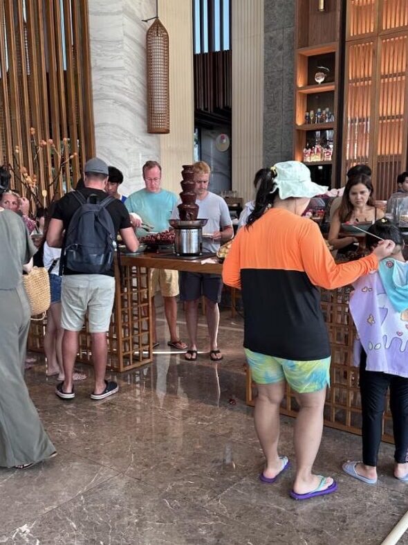 プールも海もシェラトンの方が個人的には良かったです。Mövenpickでは、「チョコレート アワー」というチョコレートファウンテンやお菓子などがあるサービスがあり子供がとても喜んでいました。