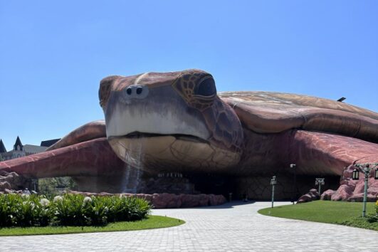この日はとても暑かったので、私たちは、まずプールで遊びました。スライダーもあり、子供向けのエリアもあります。朝から向かったので、子供向けエリアはお客さんより監視員のほうが多いくらいでした。その分しっかり見守っていただけました。スライダーもほぼ待ち時間なしです。そのあとは遊園地で、観覧車などをみんなで楽しみました。最後に水族館を見て回りました。水族館の入口の亀がとてもインパクトありますよね。夜のプロジェクションマッピングが有名のようですが、暑さで少しばててしまったのと子供がお部屋のプールで遊びたいということで、夕方にはVinWondersを去りました。シェラトンからはとても近くて往復シャトルバスを使いました。